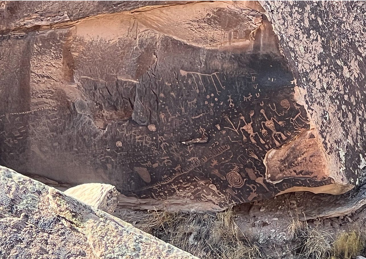 I'm thinking about the petroglyphs, the ones in the Arizona desert that are scrawled on stains in rust colored stone. They might be 2500 years old, though I guess it's hard to say. They overwhelmed me, even from a distance. All I could imagine was gently tracing a finger over the stone and feeling some warmth on the other side happily matching my own.